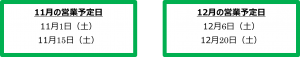 この度、誠に勝手ながら、11月・12月の2か月間につきまして、営業日を下記の通り変更させていただきます。